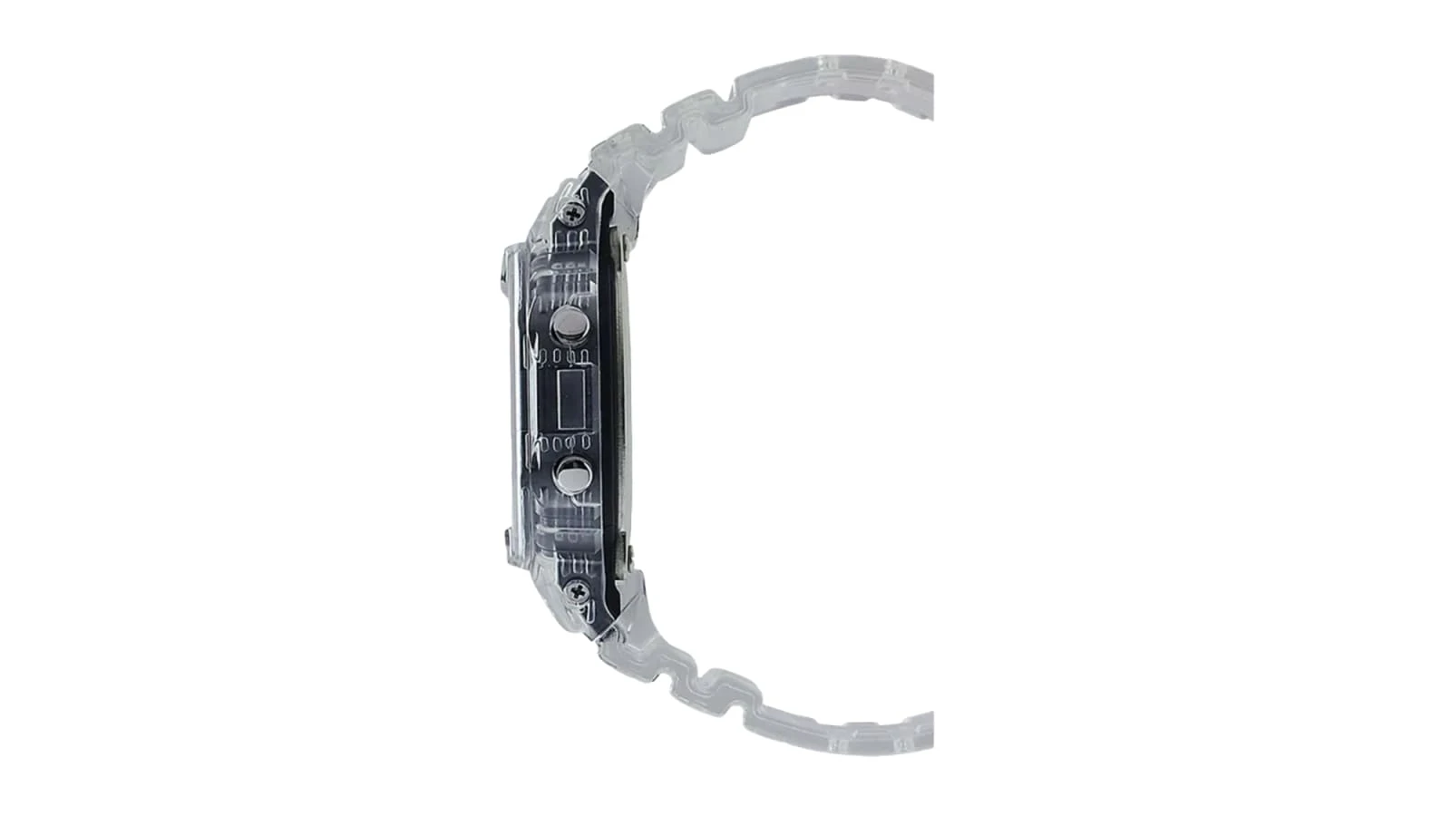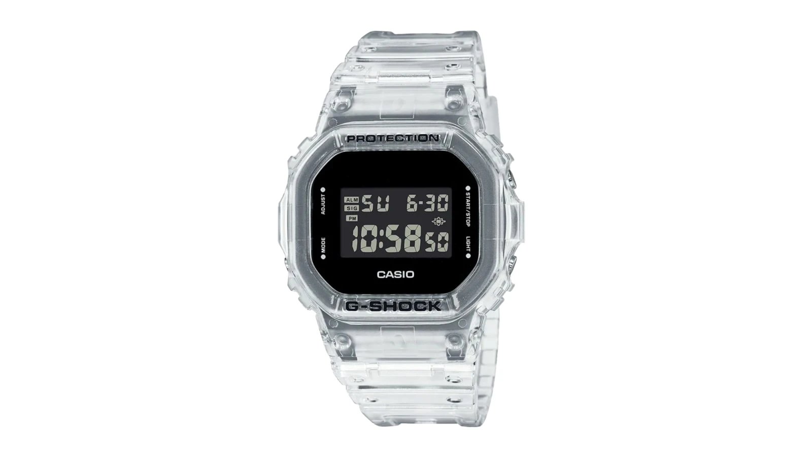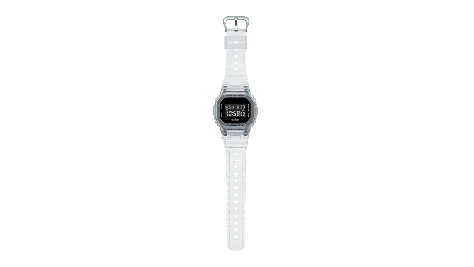 Part of the stylish new G-Shock Transparent Pack Series, the DW5600SKE-7 features unique semi-transparent, white resin components with a standard square digital dial.