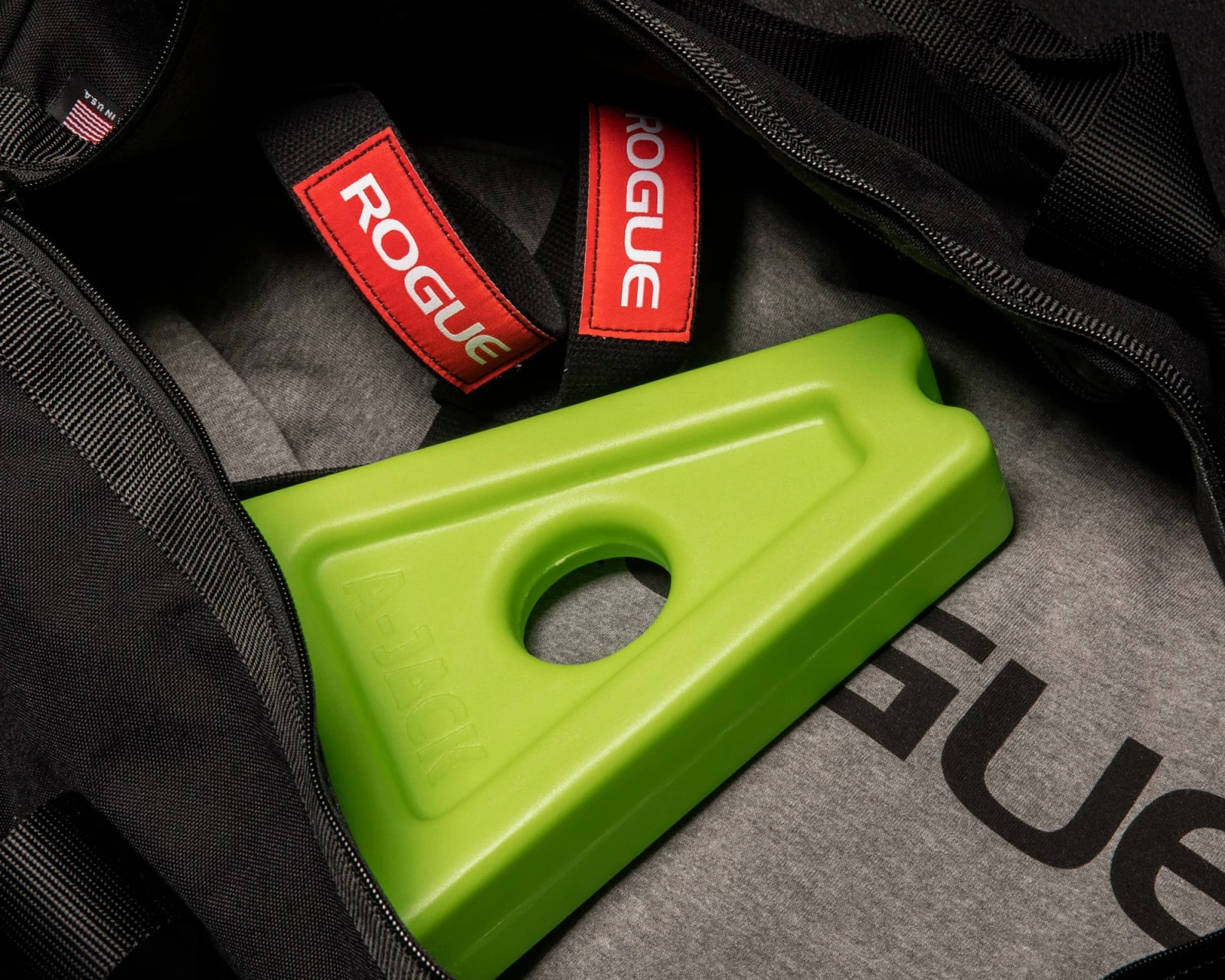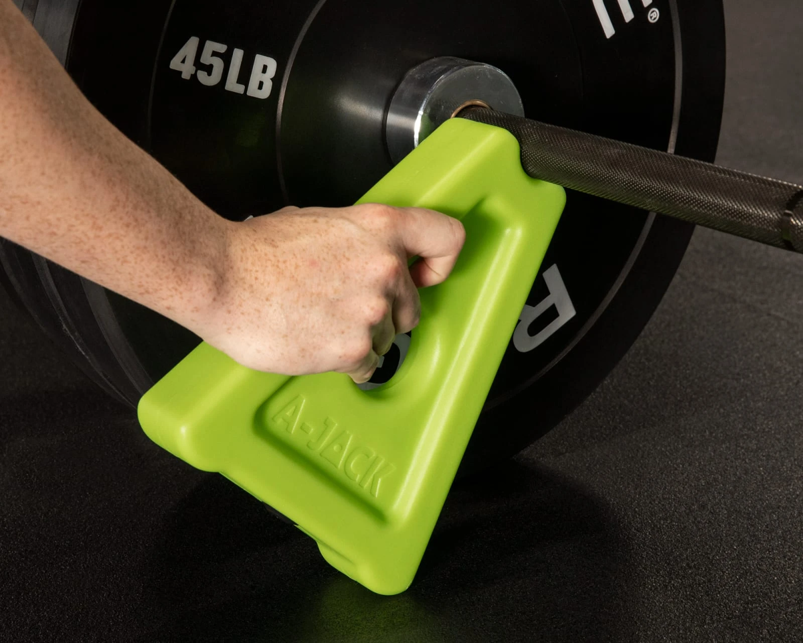 The A-JACK measures 9-⅛” tall with a 7” wide x 2” thick base, creating a strong, triangular A-frame foundation. Grooved edges and a round center opening enable a firm grip during set-up, as the user can simply position the angled top portion of the A-JACK under the bar (at the interior edge of the sleeve) and gently roll the bar into a stable elevated position for easy plate loading or unloading. When done, simply roll the bar back off the jack.