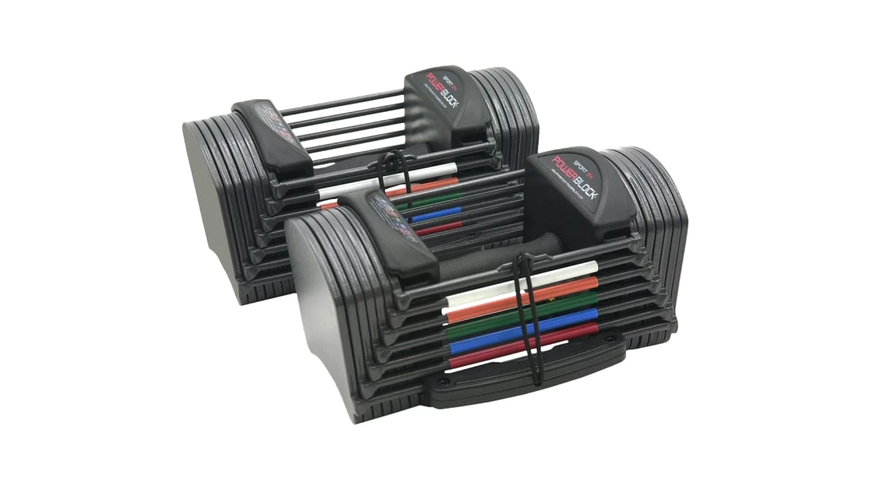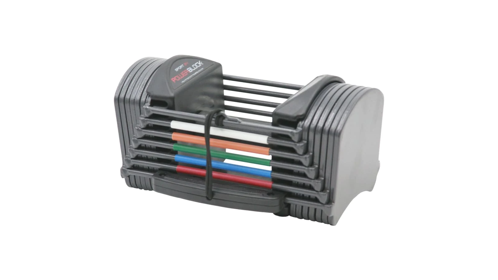 Each PowerBlock Sport 24 features a welded steel construction with color-coded side rails for quick weight increment identification. To change the weight in just seconds, slide the provided selector pin into the rails at the weight you want; the durable polypropylene pin is magnetized to ensure it stays locked in. Then reach inside the “core” and grab the ergonomic, rubber-grip handle. When you lift the handle, the weight you selected is lifted along with it.