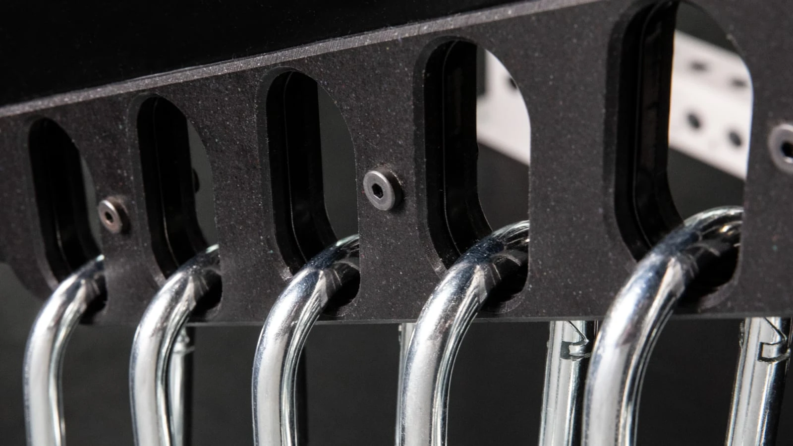 The Rogue Monster Chain Hanger is a bolt-on attachment designed exclusively for use with our 3×3” Monster Series racks and rigs. Constructed from 0.25” thick laser-cut and formed steel, the hanger is designed with a jog bend in the bracket, ensuring the superior strength needed to hold heavy lengths of chain. With a total of (6) 1” wide laser-cut carabiner slots, this simple rack add-on offers any gym a dependable, accessible, and organized new solution for multiple chain storage.