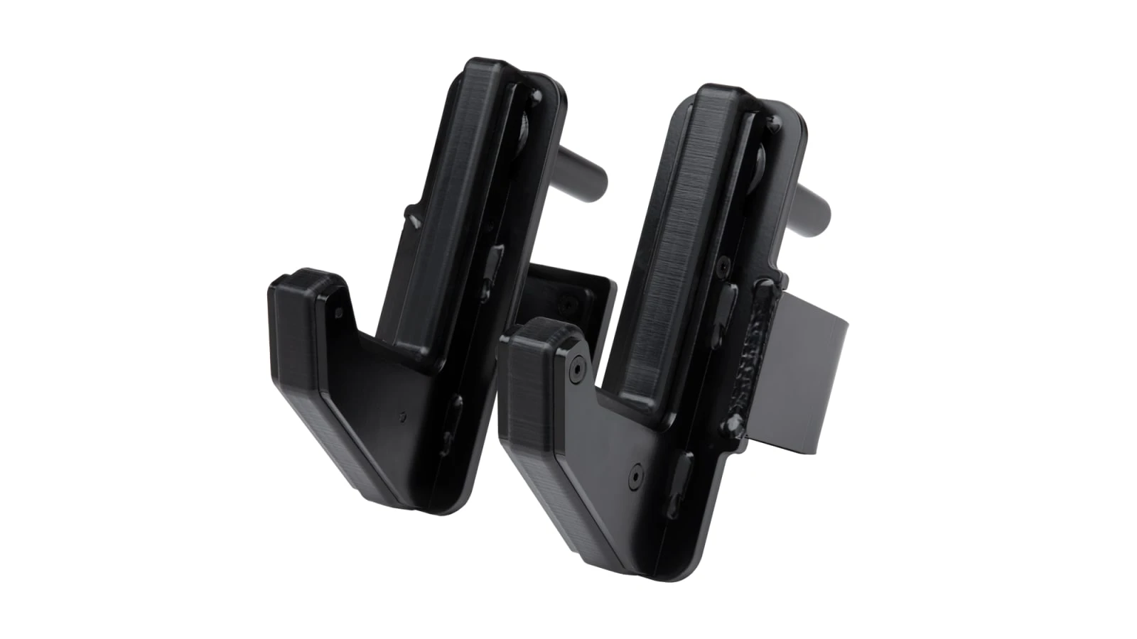 Monster 2” Sandwich J-Cups: 2” width, 10” height, ⅜” plate steel, 20 LB The side plates fit into a recessed, machined plastic core (2″ wide) to prevent metal-to-metal contact. The hardware (that connects the plastic to the side plates) is also recessed, preventing the bar or a user’s hand from scraping against them. Welds are insides the side plates for a clean edge, and UHMW plastic is featured on the clasp and back plate to prevent damage to the uprights. A thin piece of rubber on the side of the clasp also softens contact between the clasp and upright when the J-Cup is swung into place.