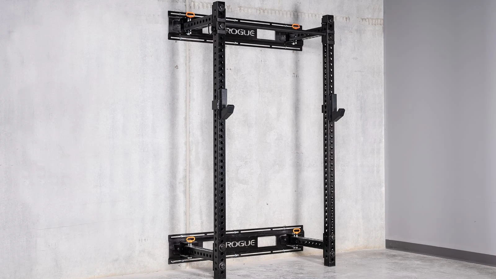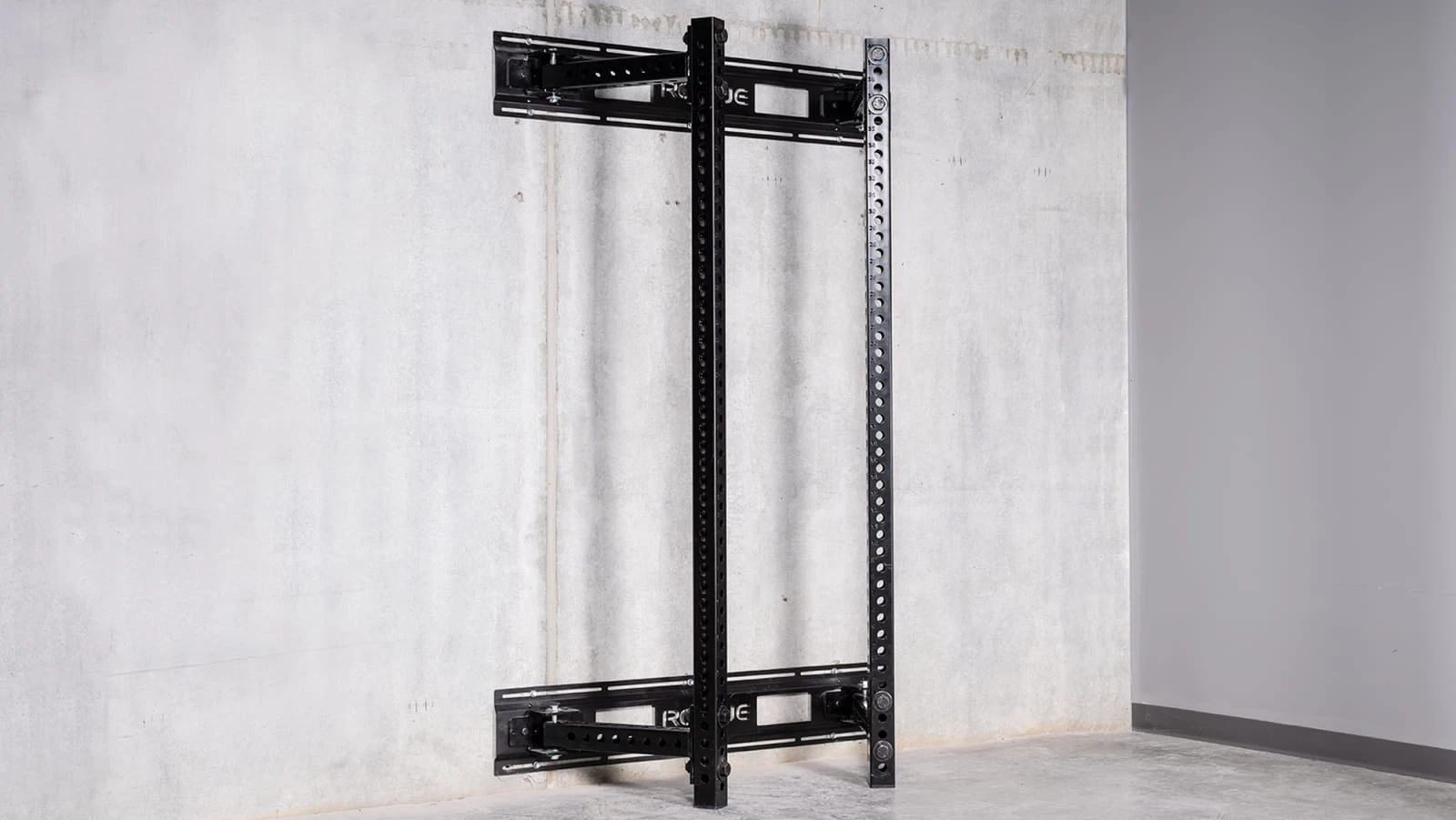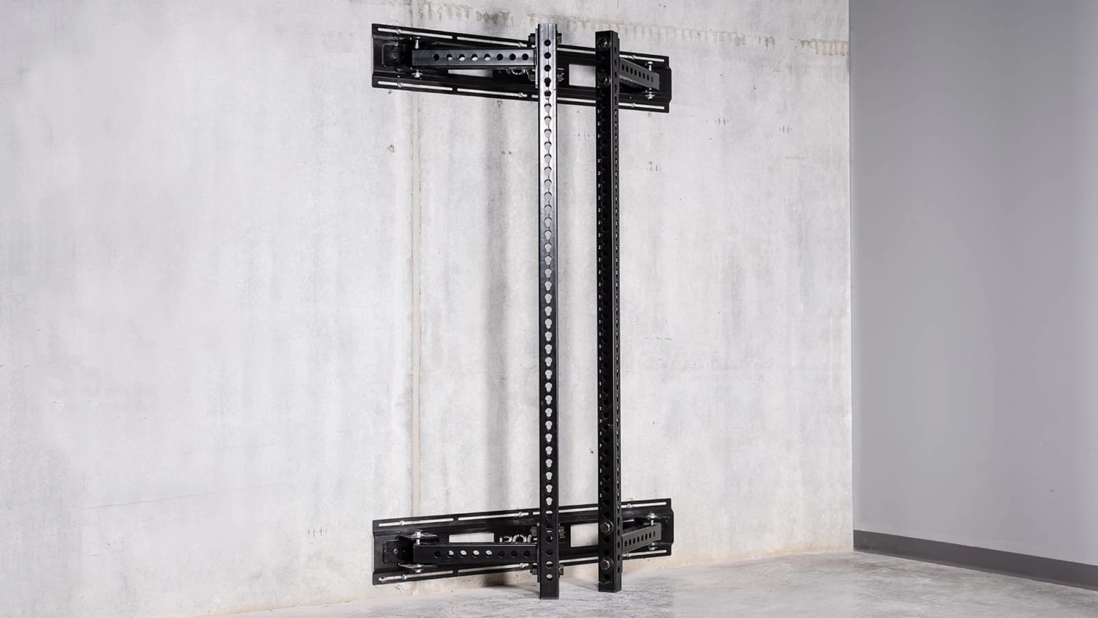 The goal with this design was to create a more space efficient, wall-mounted version of our standard Monster RM-3 Rack; one that could be conveniently folded inward or outward against a gym wall, yet still offer the sturdiness and versatility of a stationary Monster unit. To achieve this, our engineering team developed a unique hinge-and-pin system that is both easy to install and rock solid. In use as a squat stand, pull up rig, or power rack, the feel with the Monster Fold Back Rack is miles beyond lighter setups that use thinner steel.