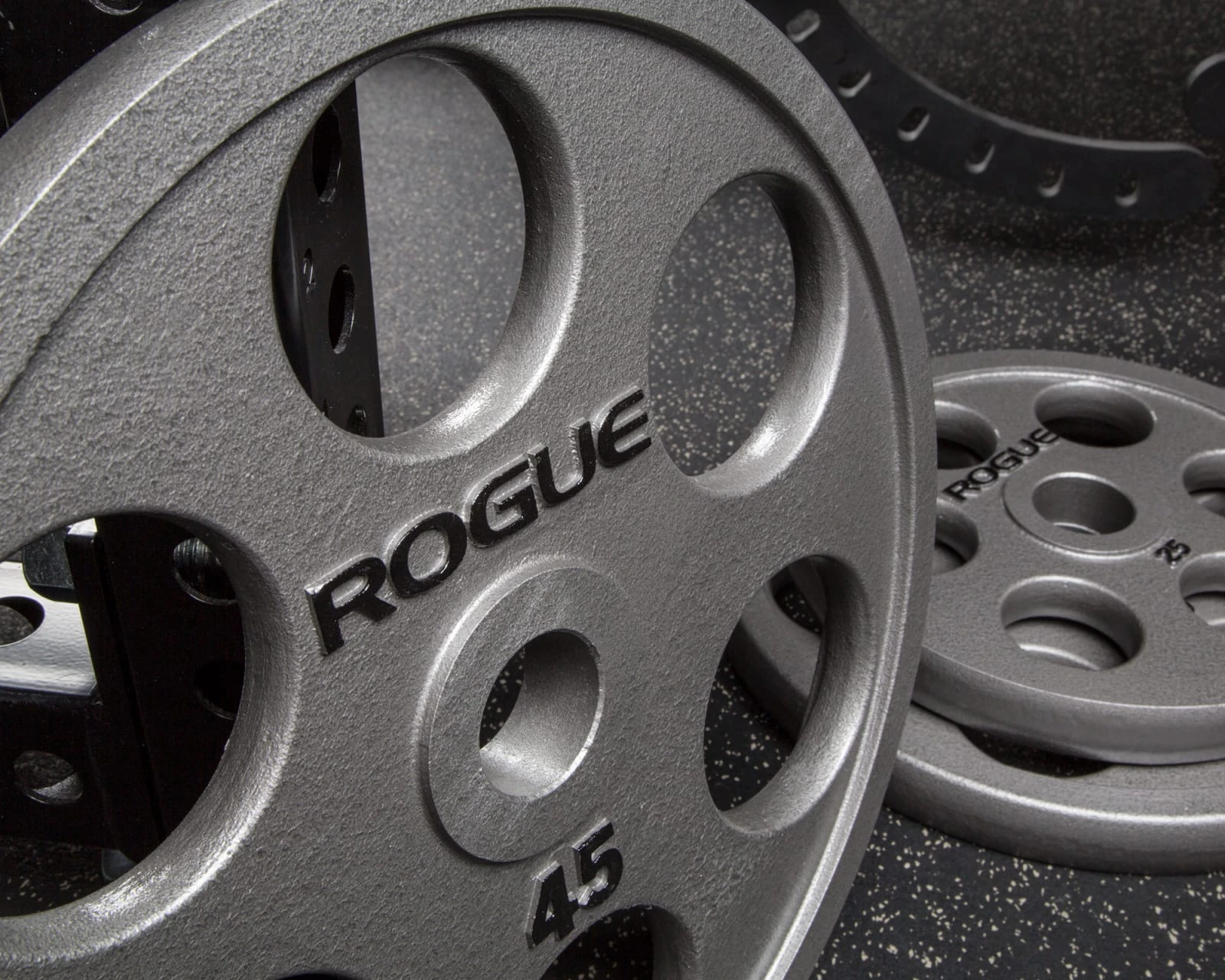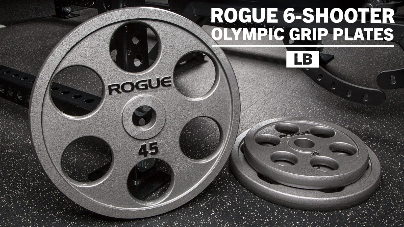 Our Rogue 6-Shooter Grip Plates feature a unique gray hammertone finish, black text, and six symmetrical grip holes spaced out around the circumference of each 25LB, 35LB, and 45LB plate (a Urethane Coated 6-Shooter is also available). The holes are precision-cut and in close proximity to the raised lip at the edge of each plate, offering athletes a comfortable grip and an easier way to lift, carry, or load a plate from any angle.