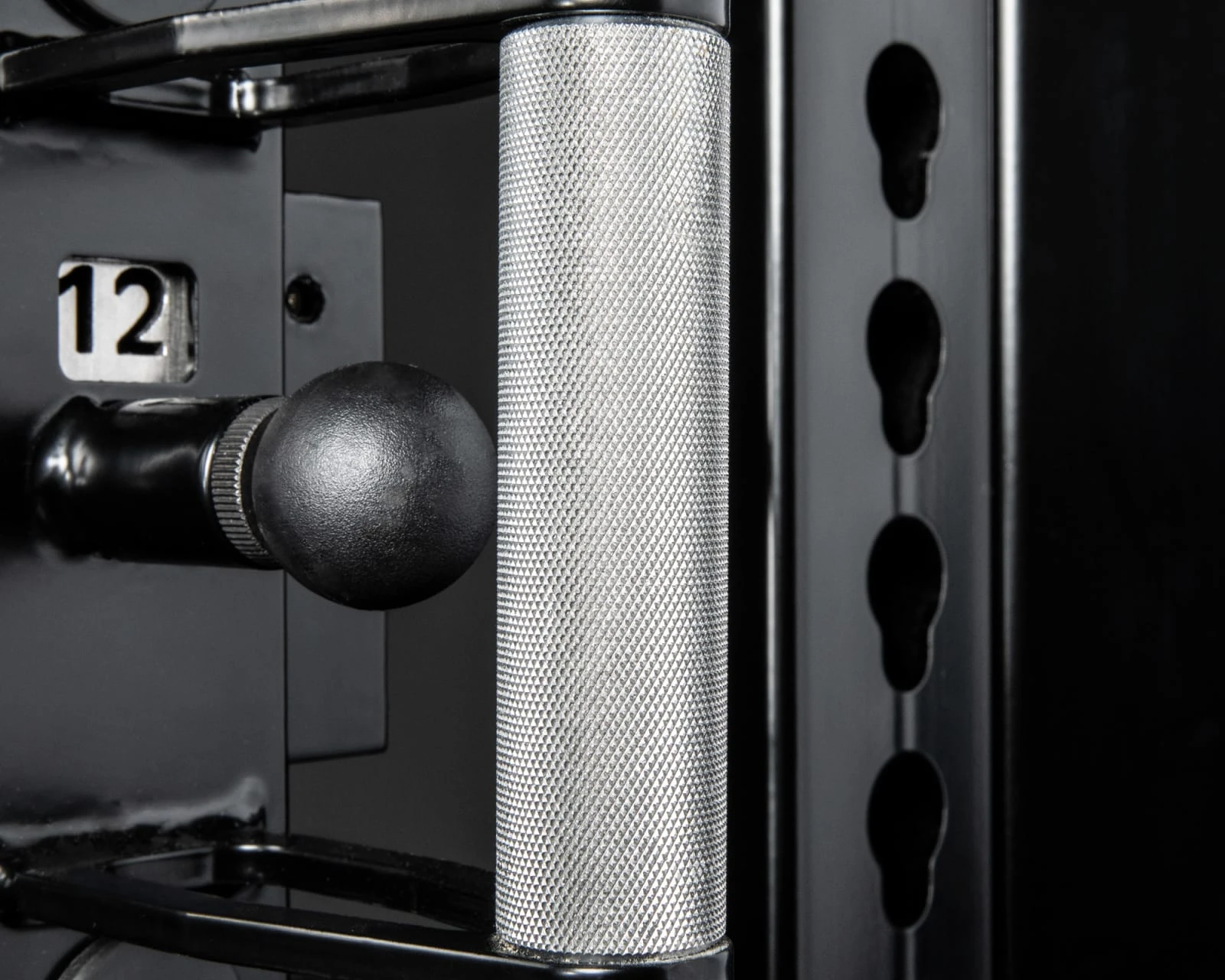 The single handle pulley assembly features a 180-degree swivel and can be quickly set up high or low depending on the workout, utilizing the knurled stainless steel adjustment handle. There are 16 different height adjustment settings on the 2×2 rail, and with acetal pads inside the handle assembly, users can easily move the swivel up and down without damaging the stainless slide tube.
