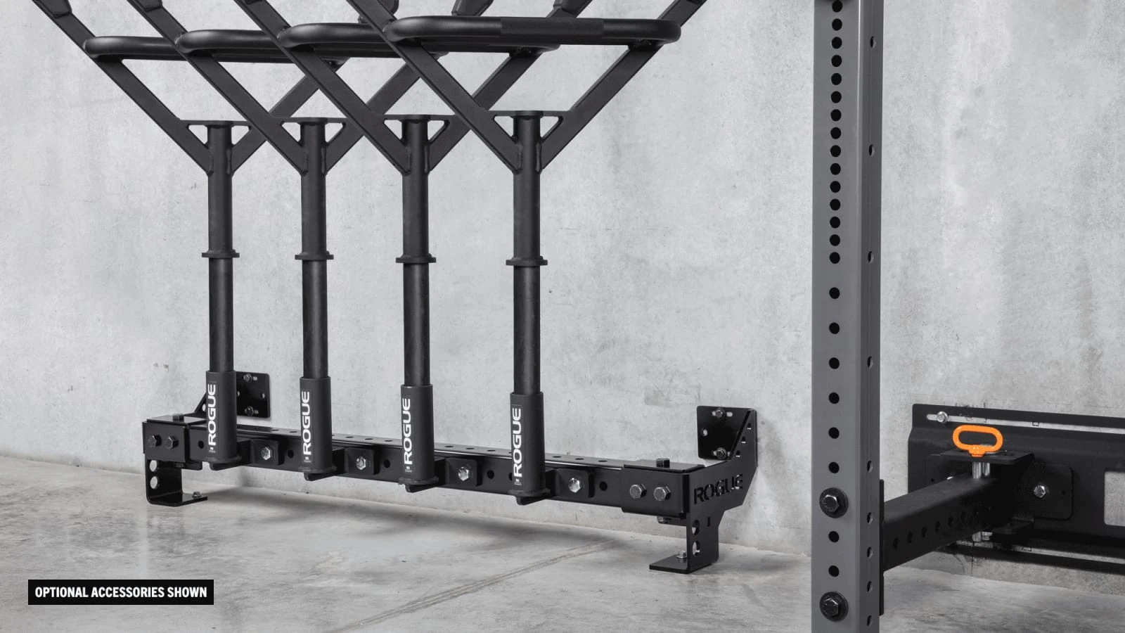 Rogue initially developed this patent-pending accessory for use in the training facility of the NHL’s Columbus Blue Jackets, and it’s now been refined for almost any type of gym layout, with mounting points spaced at 48” to fit on standard 16”-on-center wall studs. The space efficient Heavy Rail extends just 11” from the wall (11.75” with optional stringers) and measures 7-⅛” in height (from the floor to the top of the steel tube).