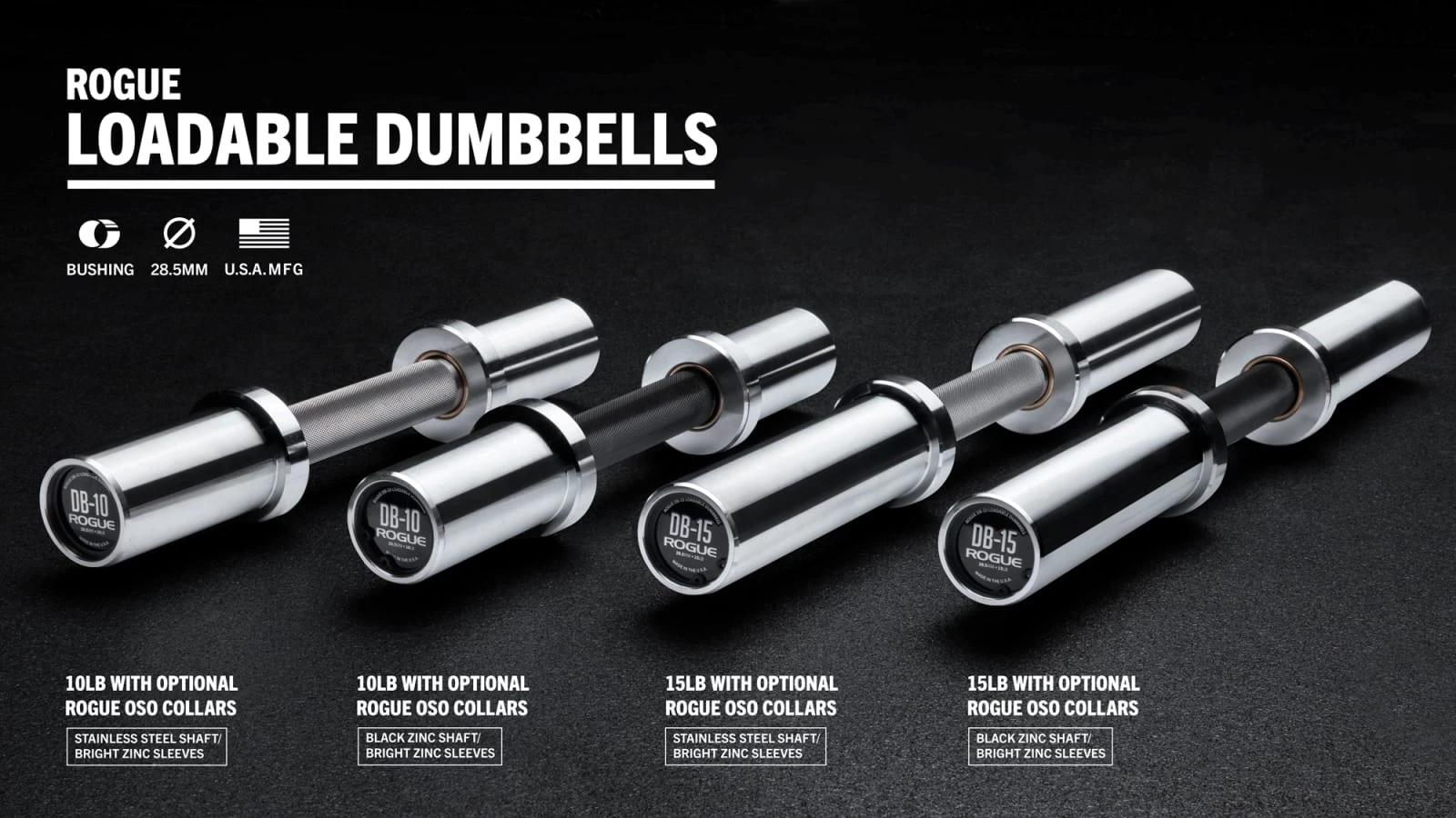 The DB-10 and DB-15 are sold individually and are available in two shaft finishes: Black Zinc or Stainless Steel (all variations have a Bright Zinc sleeve finish). Customers can also add a set of Rogue OSO Collars to their order via the dropdown menu in the purchase area. Complete design specs for all four Loadable DB options are provided below: