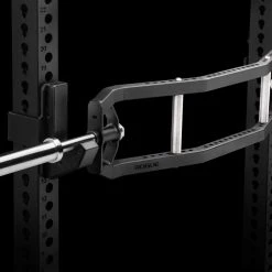 The 41” frame portion of the bar is built from 1.5” x 1.5” 11-gauge steel tubing with 1/4” plates, a machined socket, and a matte black powder coat finish. The cambered shape with 3.5” of drop allows for a greater range of motion when using the outer handles on certain movements (such as bench or rows), and also helps to improve stability, as the bar’s center of mass–relative to hand placement–is lower.