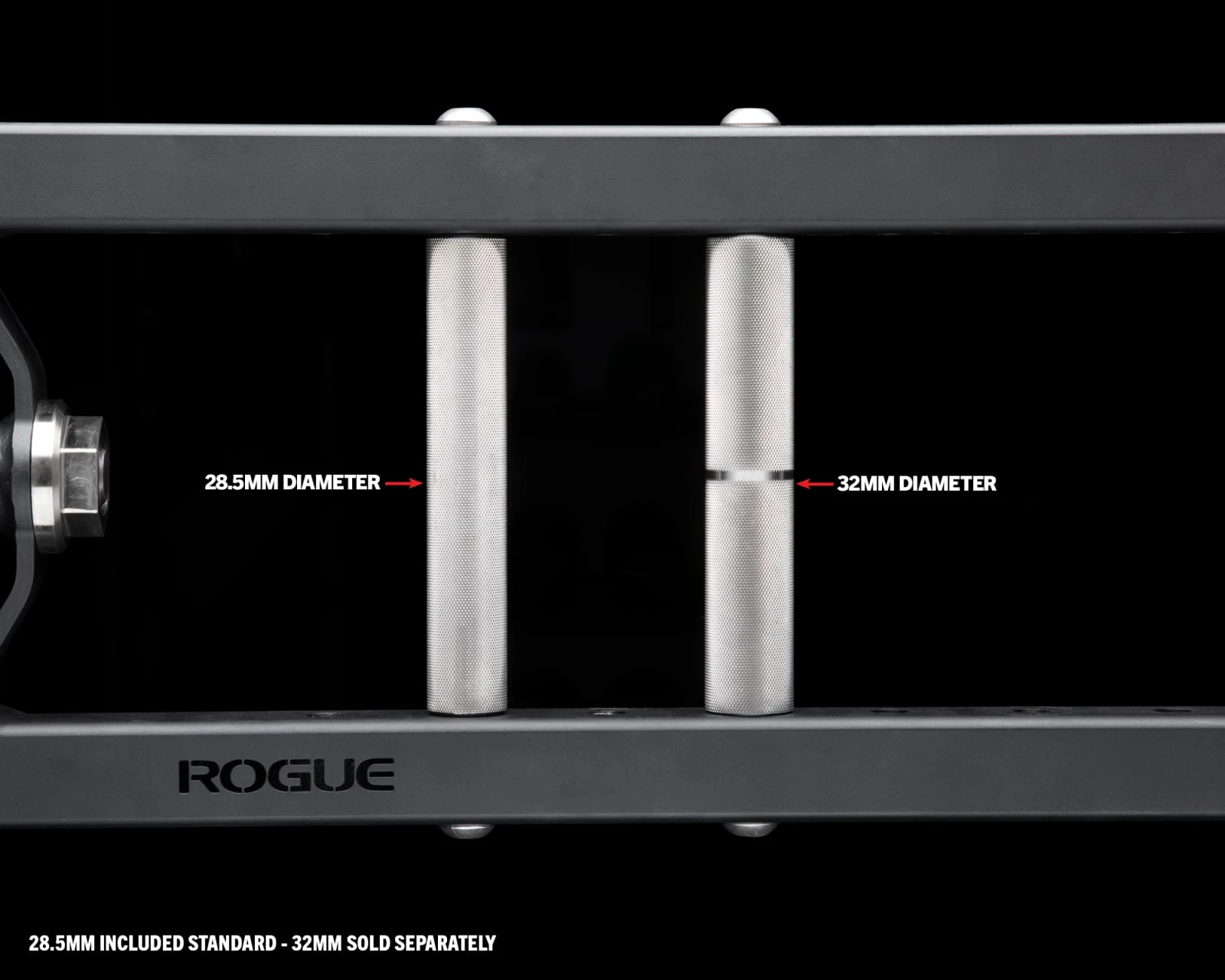 The MG-4F’s friction welded sleeves, which are available with 9” of loadable length or 15.5” of loadable length, use the same internal components as our standard barbells and rotate on shafts made from the same stainless steel as our power bars. The distance between the sleeves is also the standard 51.5”, making the bar rackable on any Rogue power rack, squat stand, rig, or bench.