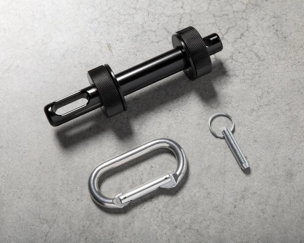 The post is fully manufactured in the USA and features a 1″ diameter shaft that affixes to your rack/rig using a Monster Knurled Knob (once in place, it will extend 3” from the face of the upright). A machined hole in the shaft allows for the attachment of an included carabiner, and acetal inserts protect the finish of your upright. All metal portions of the Monster Attachment Post are finished in Black Zinc. We’ve added an integrated detent pin into the design as an added safety measure to ensure the pin stays in place through repeated use.