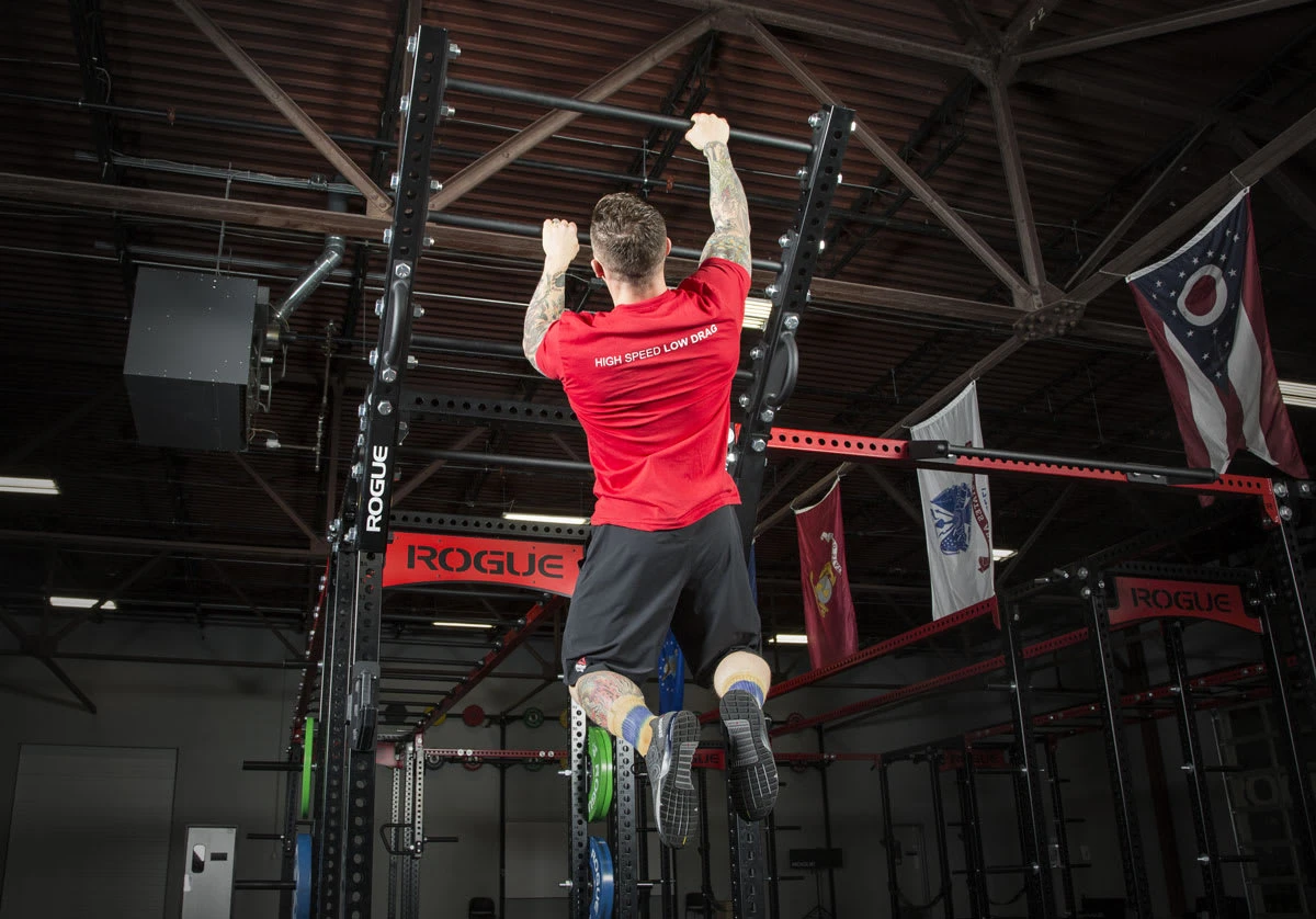 With the help of eager affiliate owners and garage gym owners, Rogue perfected the angle and height of the Flying Pull-up Bar to easily fit within most training spaces. When installed, the system Extends approximately 38.25″ horizontally from the face of the rack and 32.25″ vertically from the top of the rack. This means if the Flying Pull-up Bar set is mounted to the top of a rack, the total height reached is 140.5″ total height, 108″ upright.