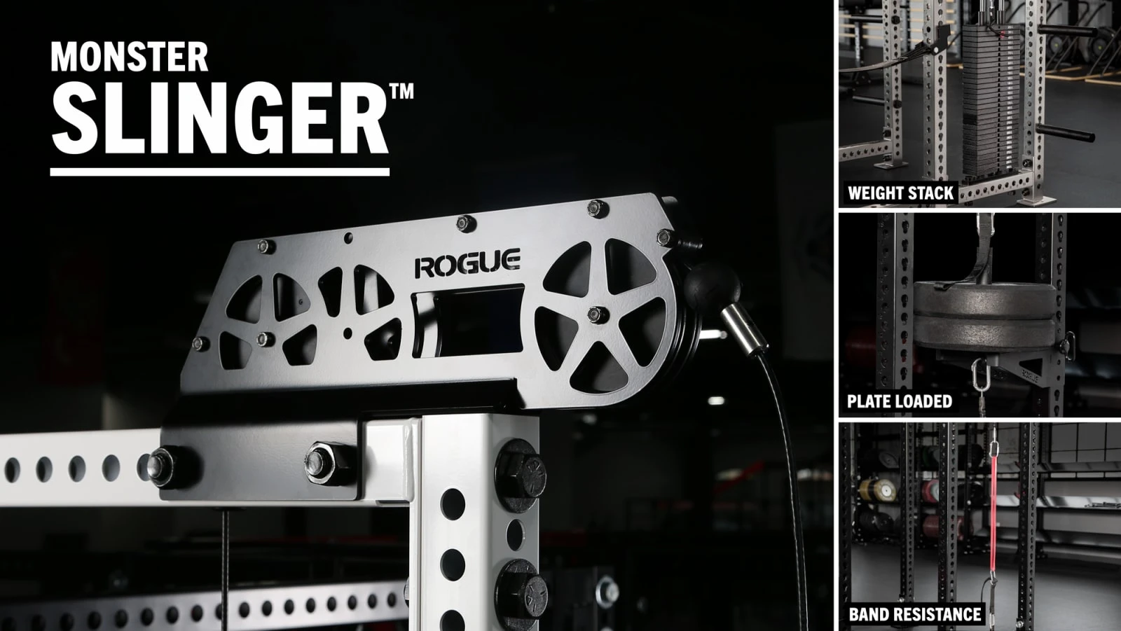 Now available with your choice of either band-loaded or plate-loaded resistance, the new Rogue Monster Slinger™ is a rack-mounted cable-pulley system designed to deliver the same training benefits of a traditional Lat Pulldown Machine with better space and cost efficiency. This attachment is compatible exclusively with our Monster Series Power Racks, and comes with adjustable components for set-up on a 90”, 100”, or 108” unit. Every customer also has the option of adding a compatible Rogue Tricep Strap, Pioneer Leather Tricep Strap, and/or a Rogue Stainless Steel Lat Bar Attachment to their order at an extra cost.