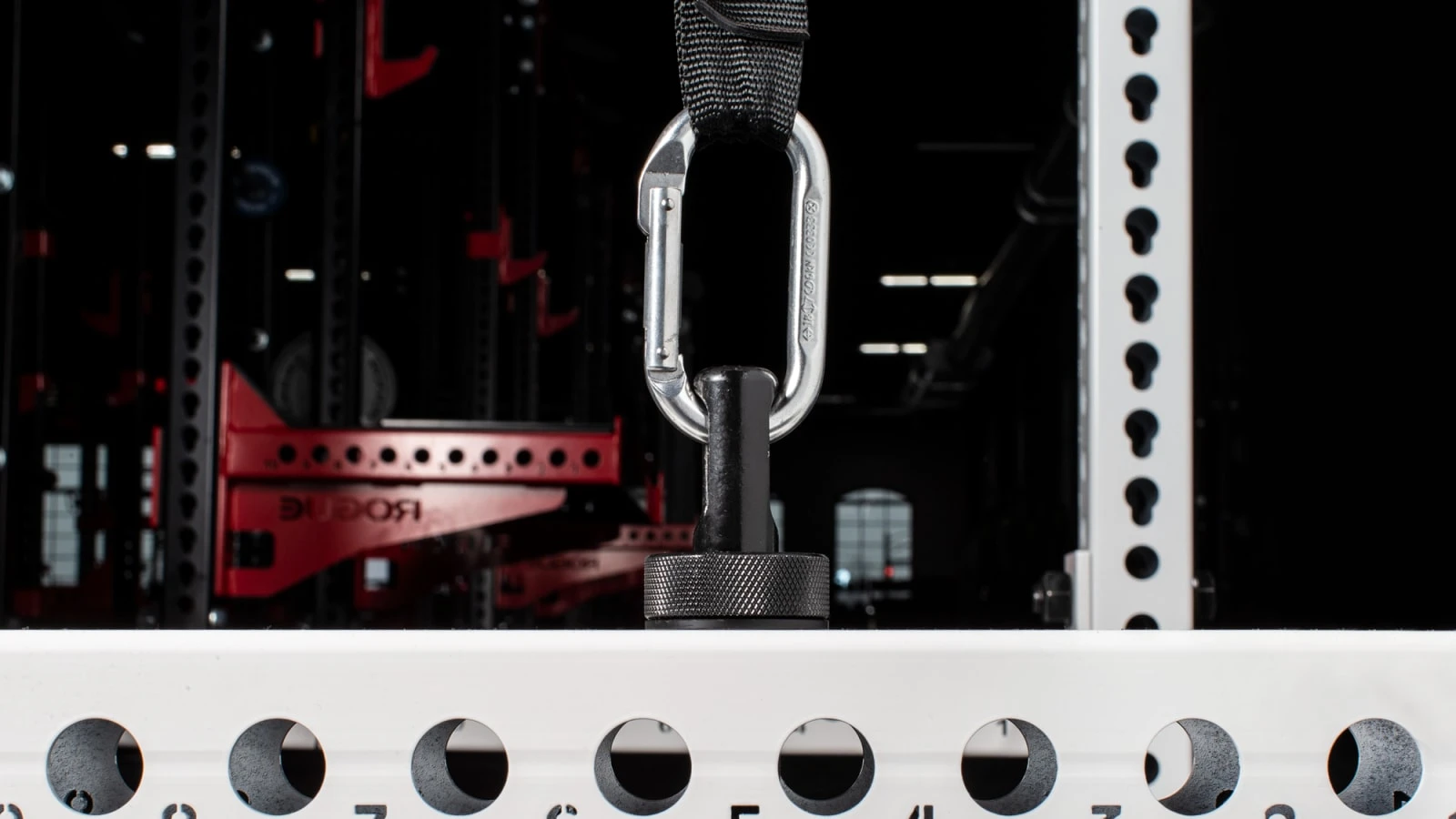 *The Monster Attachment Post is excluded when customers opt for a plate-loaded resistance option. On band-loaded Slingers, the 1” diameter post is affixed to the rack via a Monster Knurled Knob. A machined hole is included for carabiner attachment, and acetal inserts protect the Black Zinc finish.