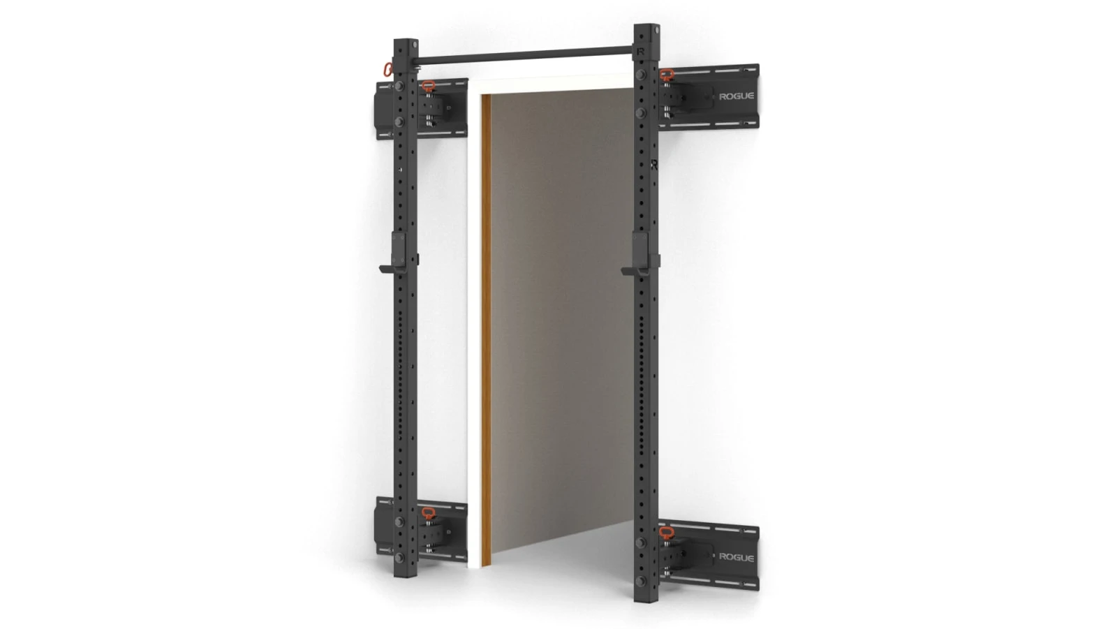 The Rogue Door Mount Rack is manufactured in the USA and features two 3×3” 11-gauge steel uprights (with laser-cut numbering and protective UHMW feet), a Monster Lite Adjustable Pull-up Bar, and a set of standard Monster Lite J-Cups. Our convenient hinge-and-pin system ensures that the uprights are secured in place when the pin is fastened, and that they can easily fold back (away from the door frame) when not in use. When folded, the unit extends just 5” off the mounting surface, opening up substantial room in a training space.
