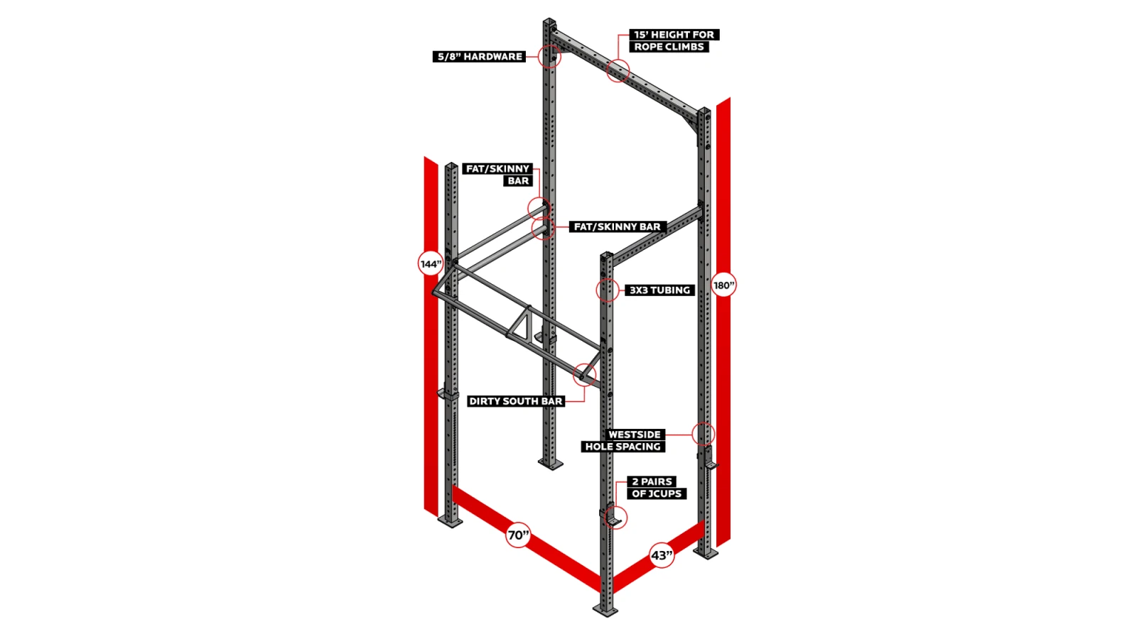 The V2 Castro Rig takes the key components from the original Castro Rig and builds upon them for a next level strength training experience. From pull-ups to squats, bench work, ropes climbs, and everything in between, the V2’s 15-foot, 3×3” 11-gauge steel uprights offer unyielding strength, with additional 3×3” beams included at the top of the rig for added stability. The V2 Castro Rig still features the adjustable Dirty South Pull-Up Bar and two separate squat rack positions, with two sets of Rogue’s Monster Lite J-cups and concrete anchors also included standard.