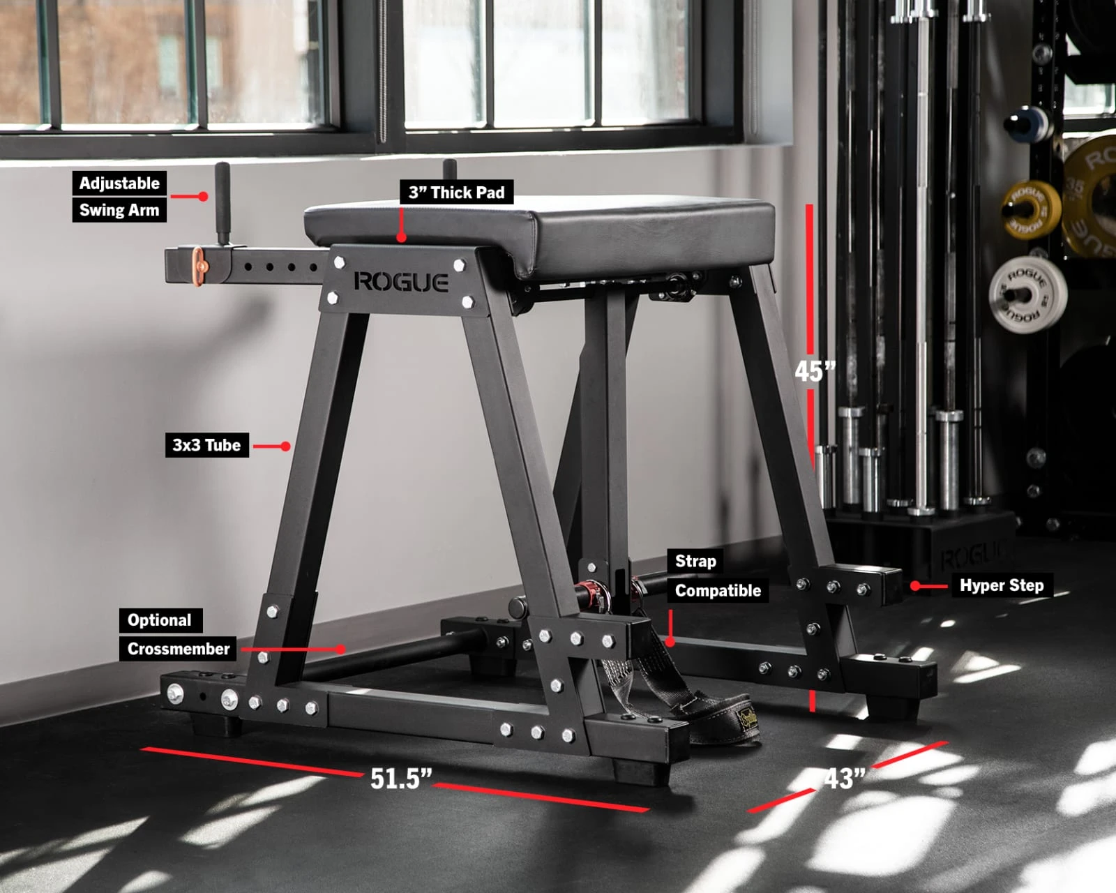 *Rogue’s Reverse Hyper Roller Attachment features a quick release design for easy transitions from the hyper straps to the roller system.
