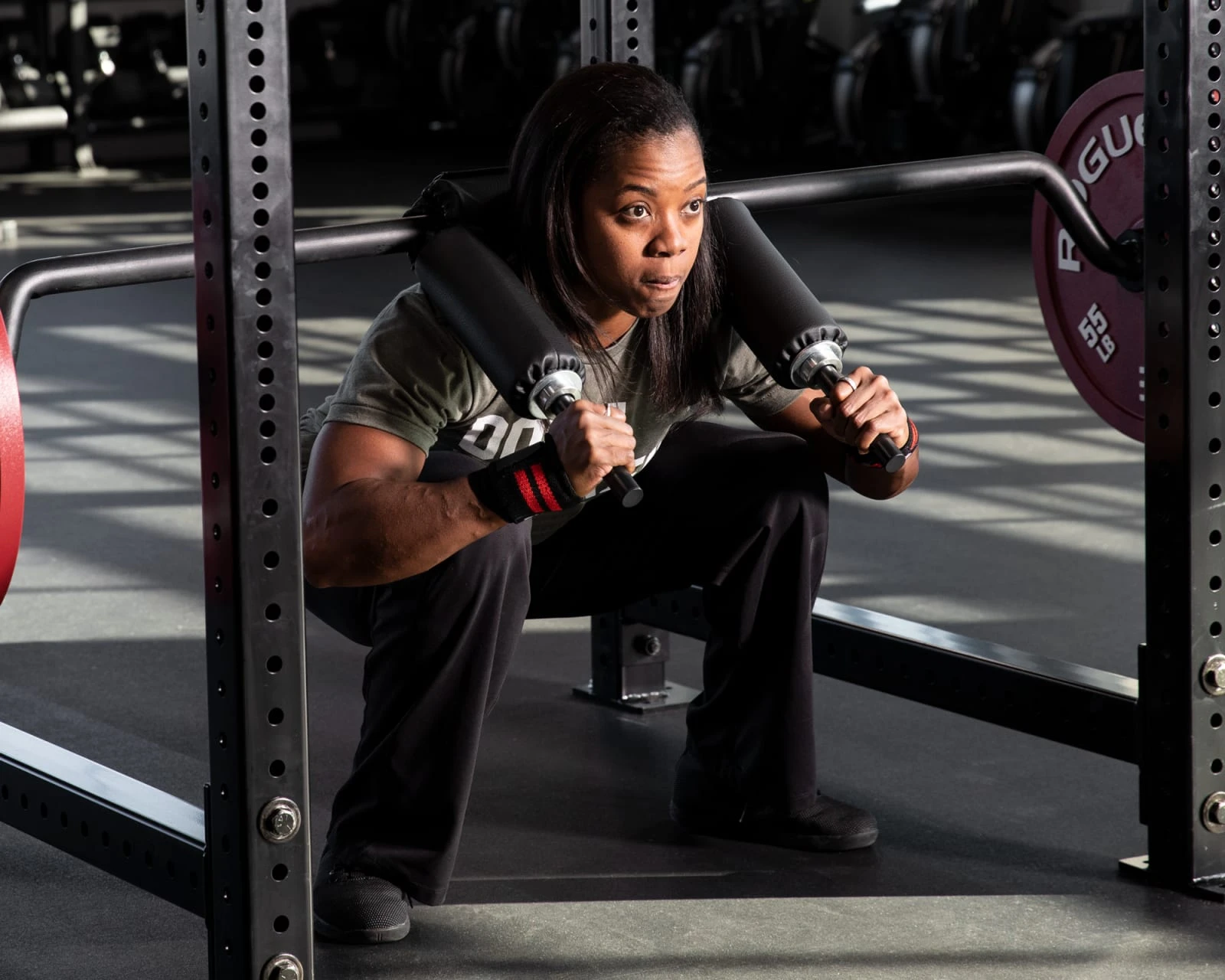 Rogue Safety Squat Bar doesn’t make squatting any easier.