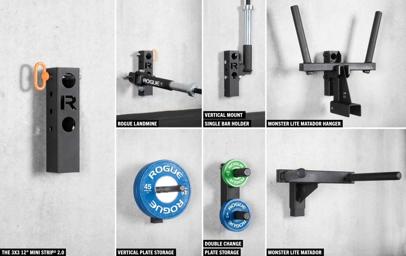 Available in a 12” and 8” format, the Mini versions of the Rogue 3×3 Strip® 2.0 are designed to enable space-efficient, wall-mounted storage of various accessories from the Monster Lite line, including: