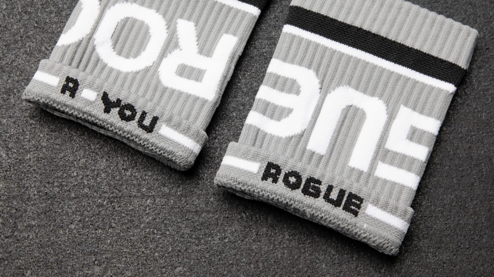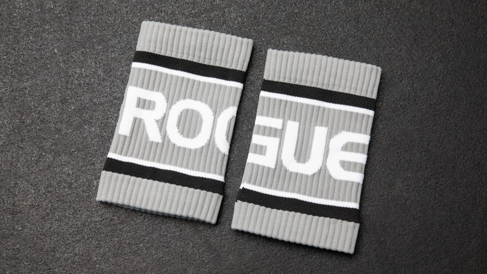 These quality, one-size-fits-all Rogue Wrist Bands are produced by Skyline Socks of Seattle, Washington, and feature the Rogue logo in a wrap-around, white on gray design. Comfortable, breathable, and flexible, these all-weather sweatbands are the simple, good-looking way to keep your hands dry and your regimen in motion.