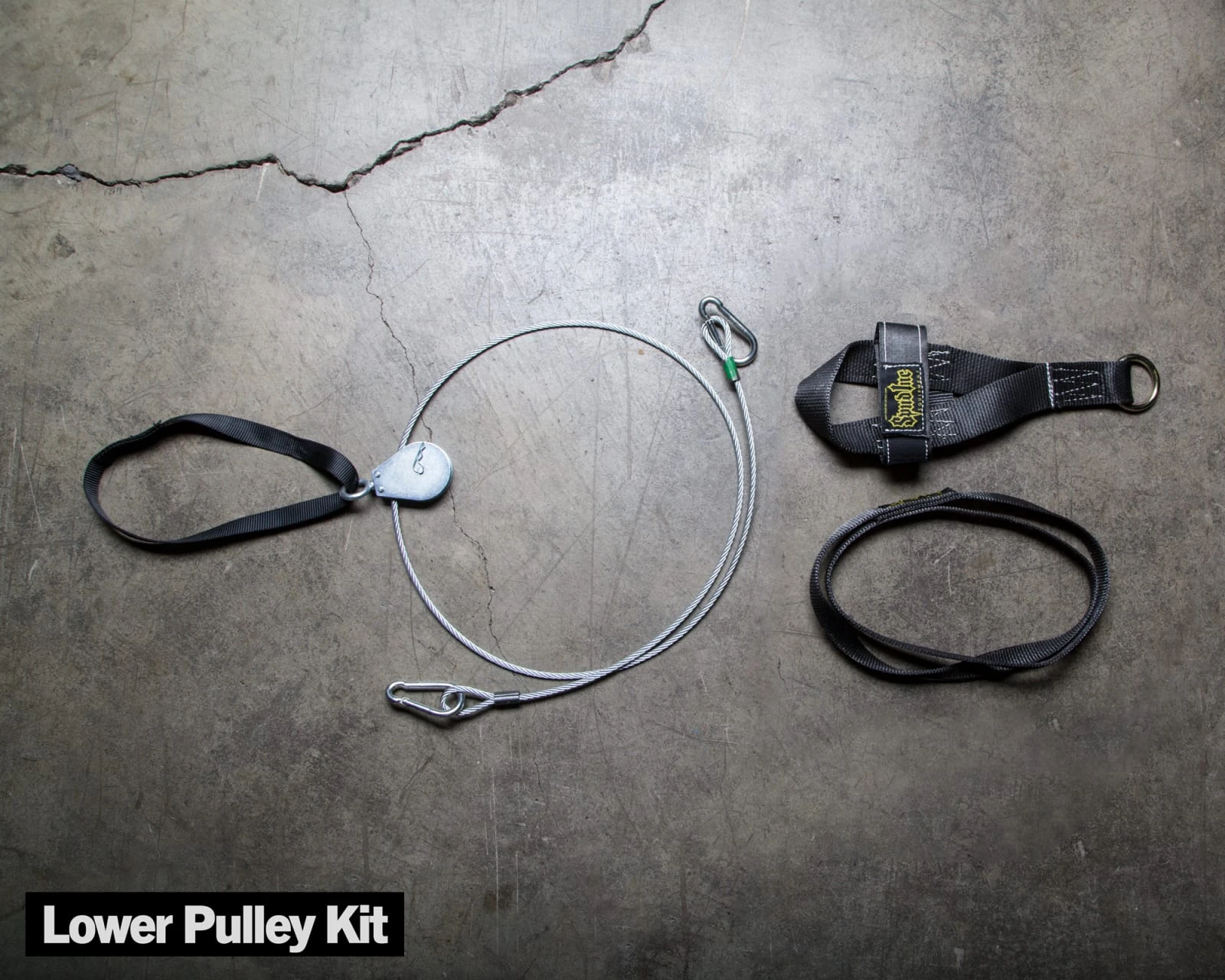 Low Pulley Set: (1) Cable: 75″ long, 0.25″ diameter, (1) 2.5″ Swivel-Eye Pulley, (2) 0.375″ Spring Clips, (1) Utility Stump Strap Handle, (1) Hamstringer Deluxe.