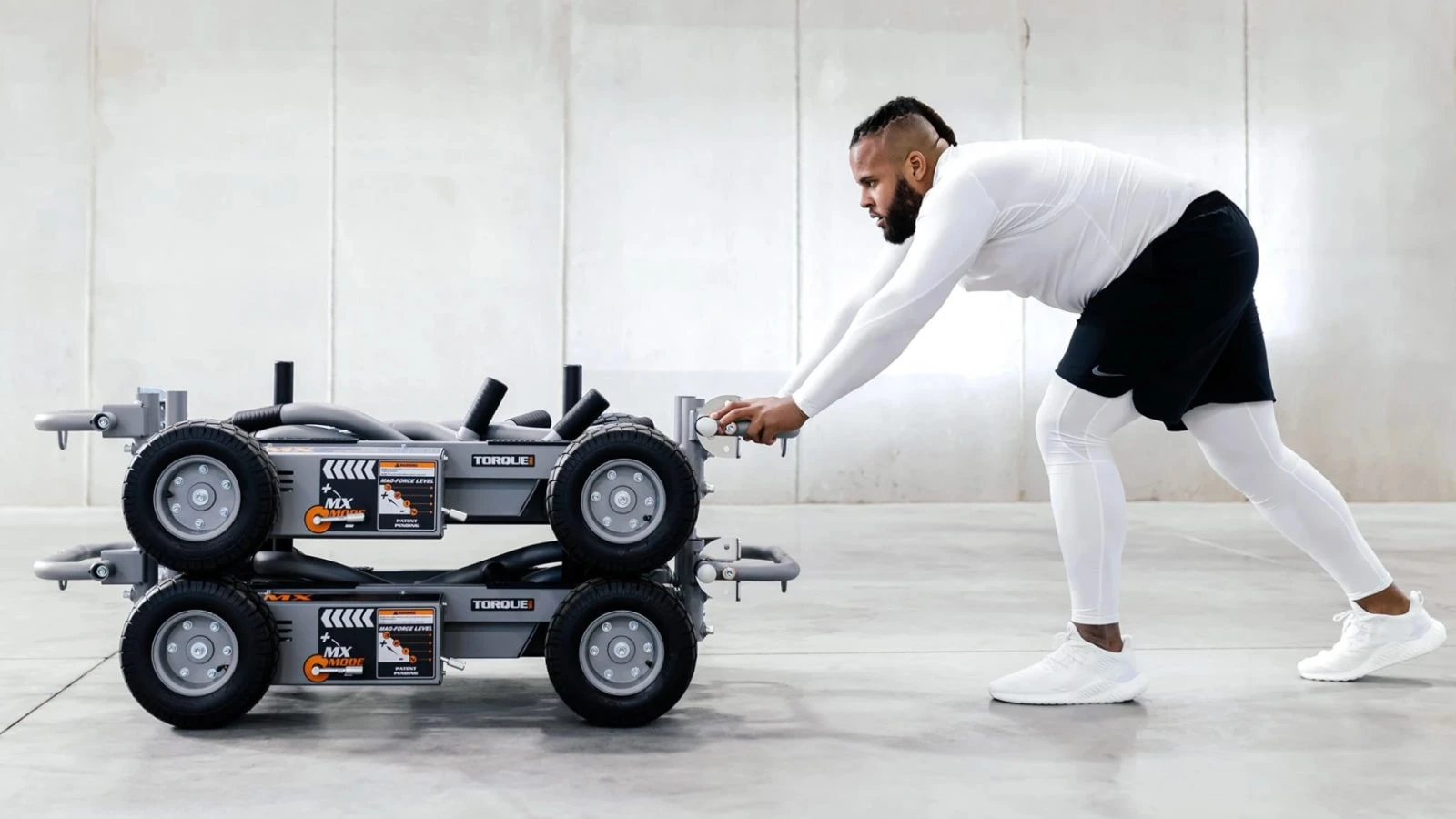 The TANK™ MX from Torque Fitness is another variation on Torque’s game-changing push sled on wheels. Rather than relying on friction-based resistance like most weighted sleds on the market, the TANK™ operates more like a fan bike, with a magnetic + flywheel design that automatically increases resistance as the sled is pushed faster; with no need to stop and load or unload plates. Because the TANK’s steel frame sits on four oversized, all-surface tires, the sled can also be used indoor and outdoor, from turf to pavement, producing far less noise than friction sleds and no gouging! The unit’s electrostatic paint finish also protects it effectively from the elements.